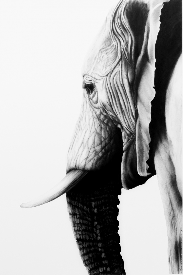 Cropped tightly against a white field, the elephant is rendered through layered charcoal marks that emphasize skin,